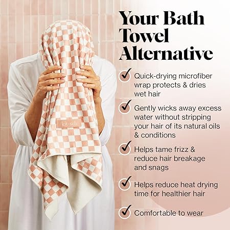 Kitsch XL Microfiber Hair Towel Wrap for Women – Ultra Absorbent Microfiber Towel for Wet, Curly, Long or Short Hair – Quick Dry, Anti-Frizz Hair Wrap – Terracotta Checkered, 40x24 inches